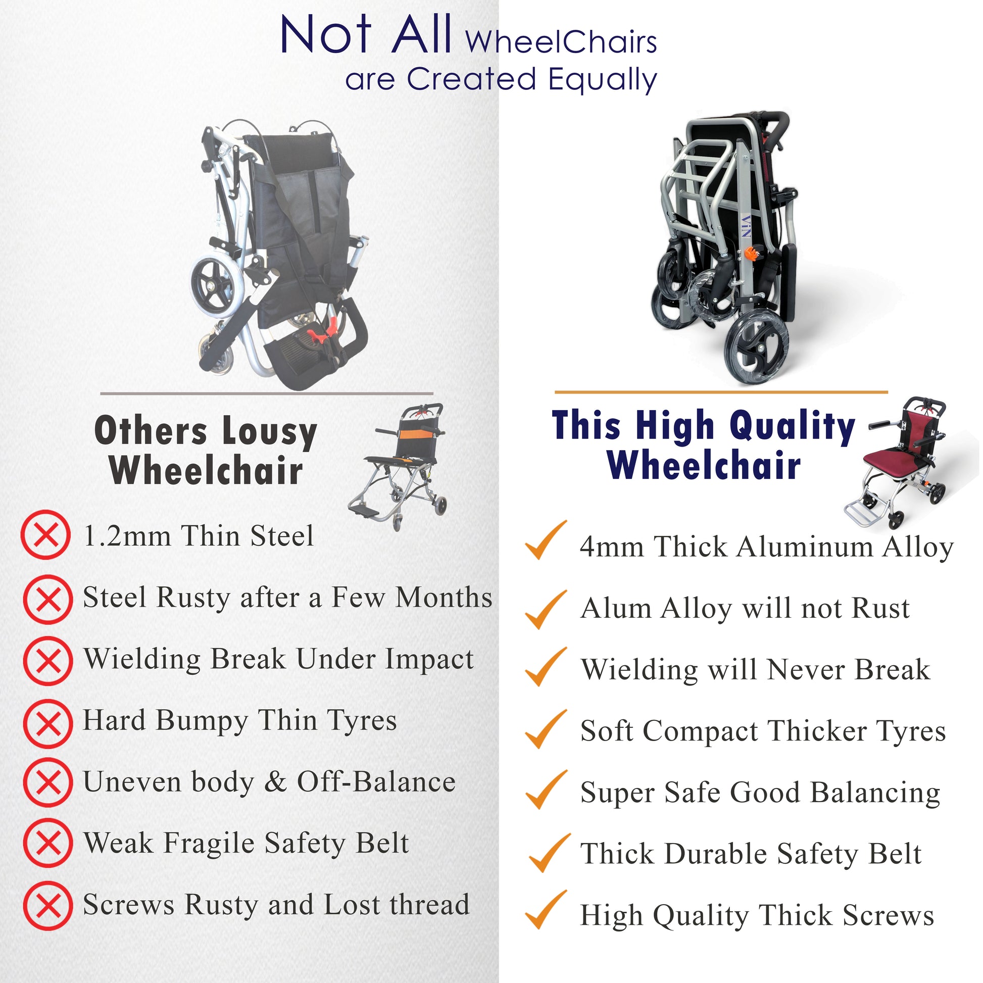 Safety - An approximately 2.5mm aluminum alloy tube is being used to construct this wheelchair to enhance safety and long-lasting while maintaining its lightweight. Most of the other cheap economical wheelchair steel tubes are less than 1mm thick, and although they are lighter, they will cause safety hazel to the user because the steel tubes are too thin. Poor quality wheelchair screws rust easily is a safety concern because Singapore is a humid environment, our screws are cast from high-quality material to prevent rust.