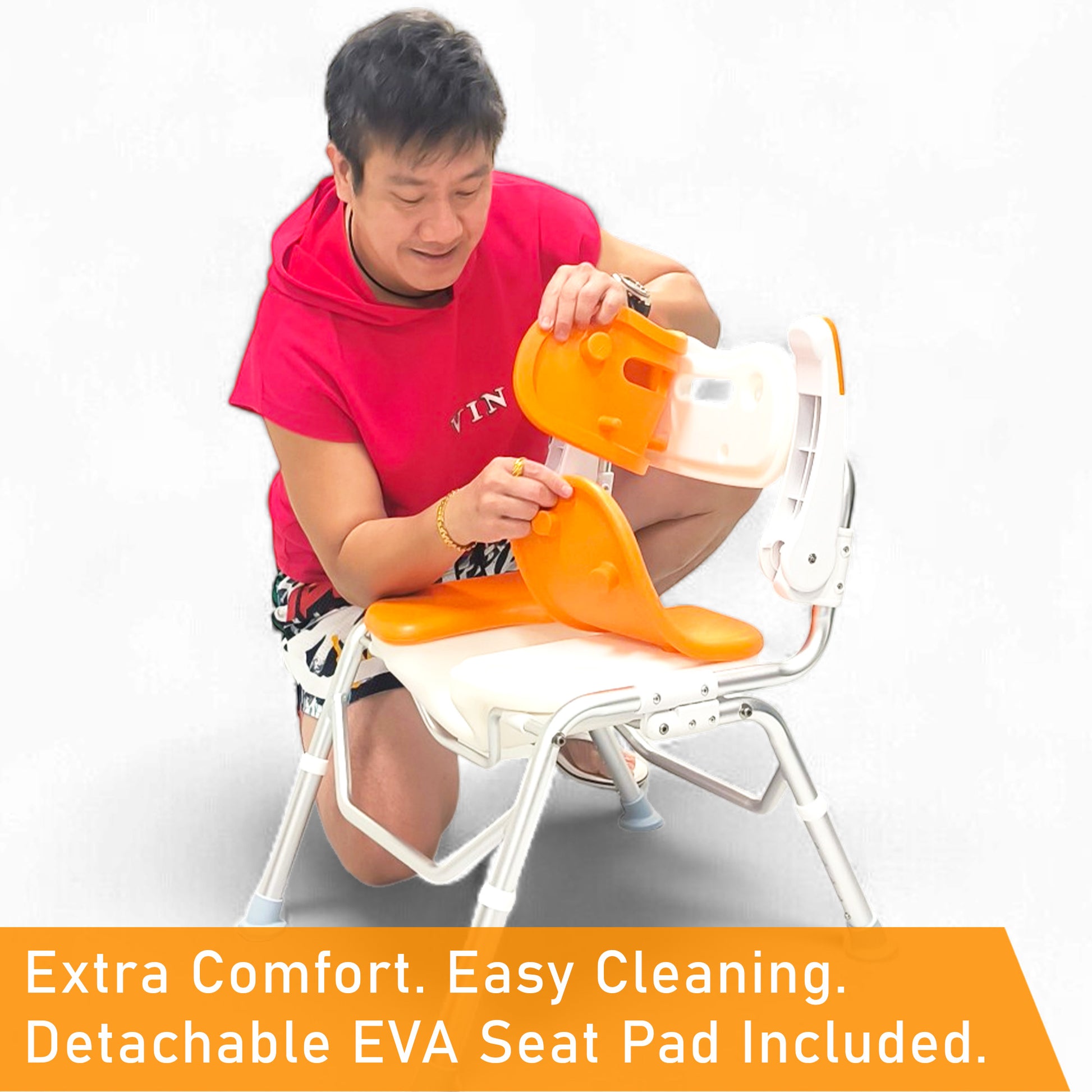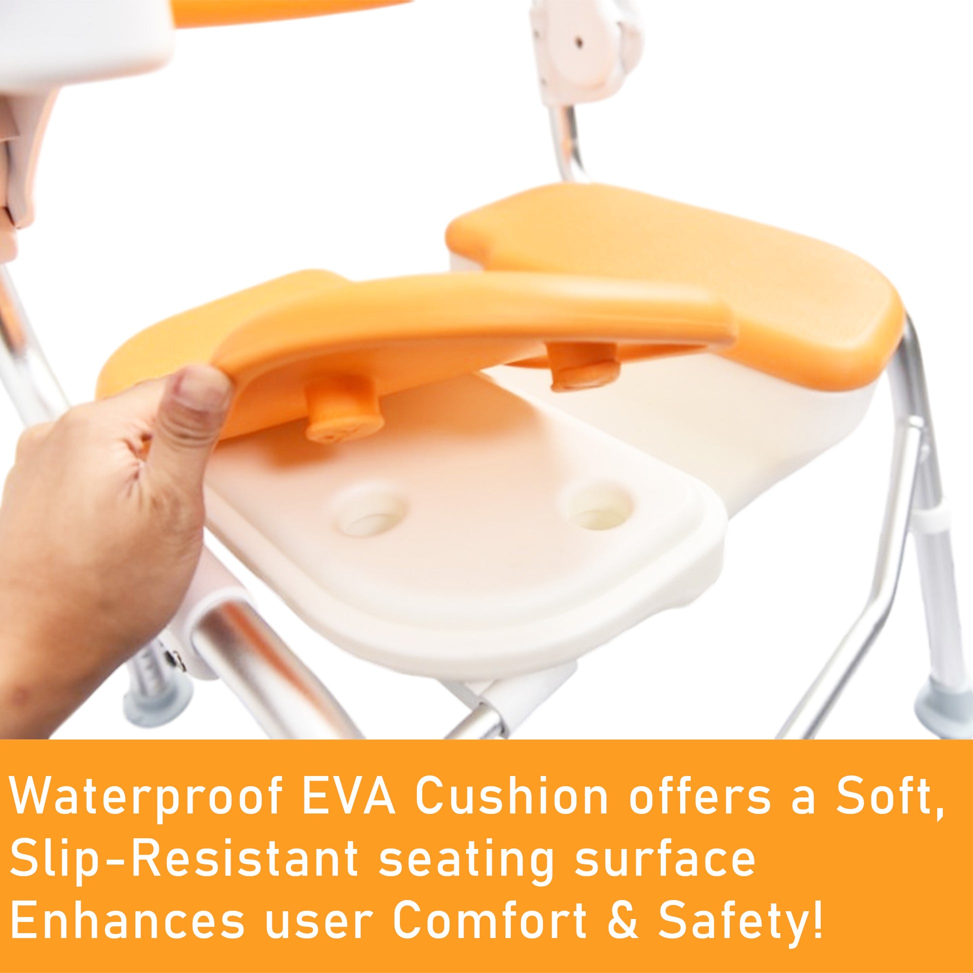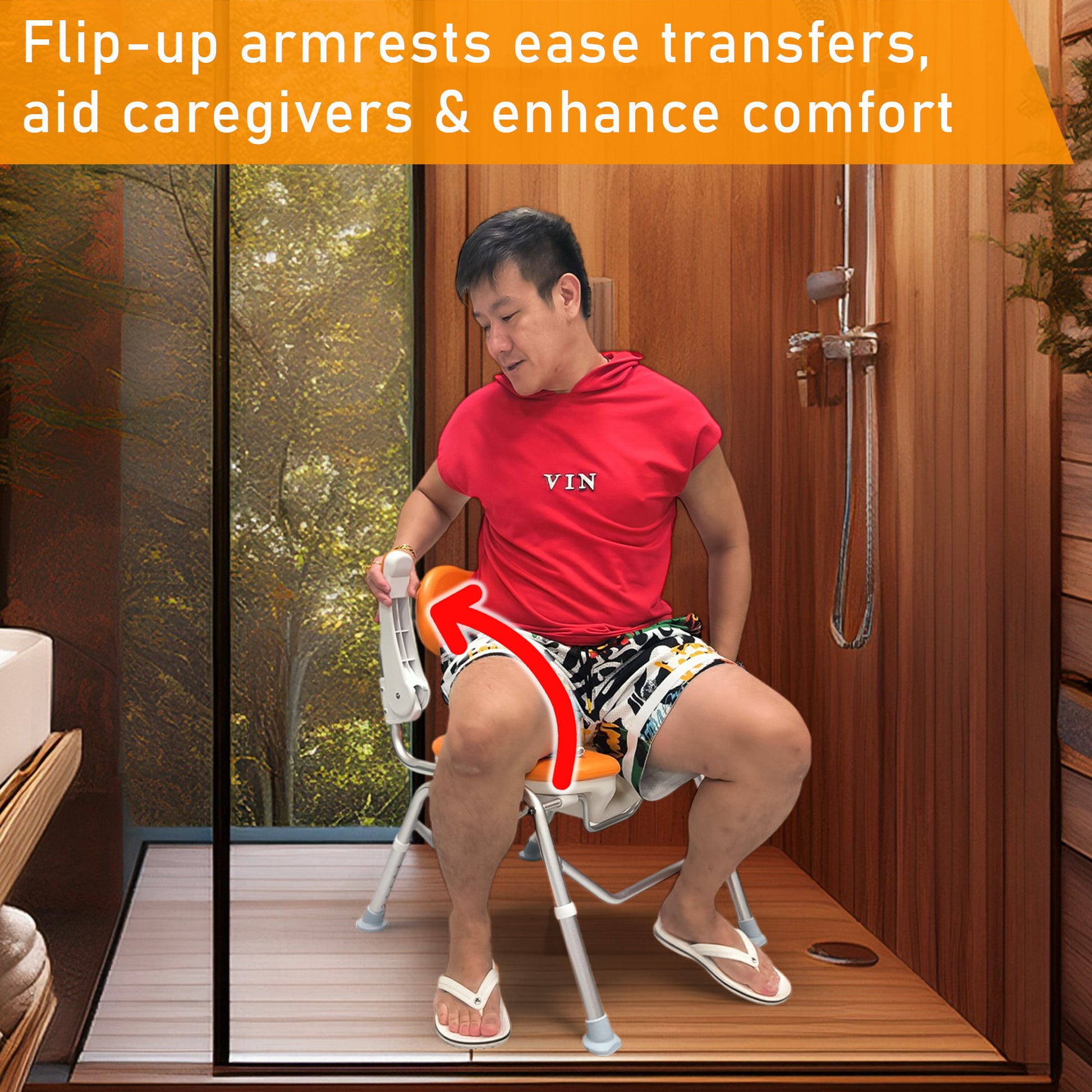 ViN-SC01 | Foldable Shower Chair + Detachable Waterproof EVA Soft Cushion + Armrest Flip Up + Adjustable height + Height Adjustable + Slip Resistant + U-Shape Groove Cutout for Private Cleaning