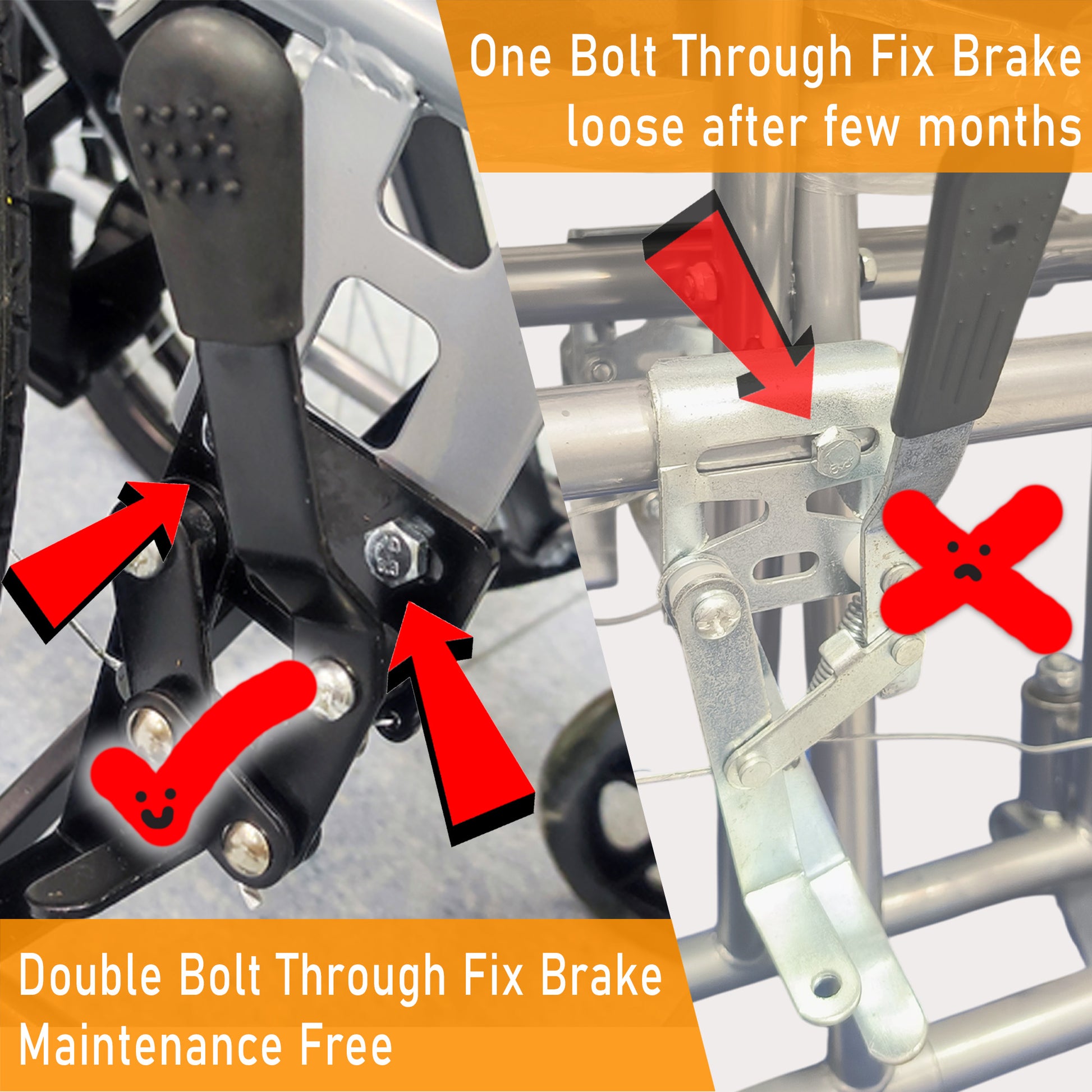 Our wheelchairs are crafted with superior durability in mind. We use 3mm thick metal tubes compared to the dangerous 1.2mm tubes used in cheap models. Polished screws prevent rust, and high-quality tires and bearings ensure a smooth ride. The braking system features a reinforced plate for secure attachment, minimizing maintenance needs. Unlike mass-produced wheelchairs, we offer only high-quality, customized products at an affordable price.