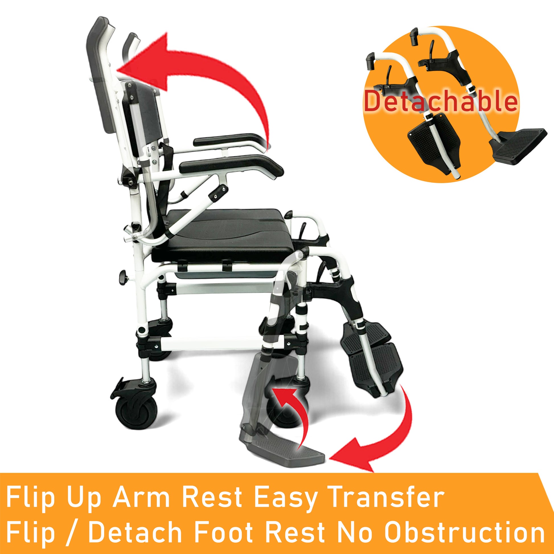 Detachable Footrest - The detachable feature allows for easy transfer in and out of the commode. The footrests can be attached or removed using a simple locking mechanism, making adjustments quick and easy. This design makes it easier for users with limited mobility in their legs and feet to transfer in and out of the commode.