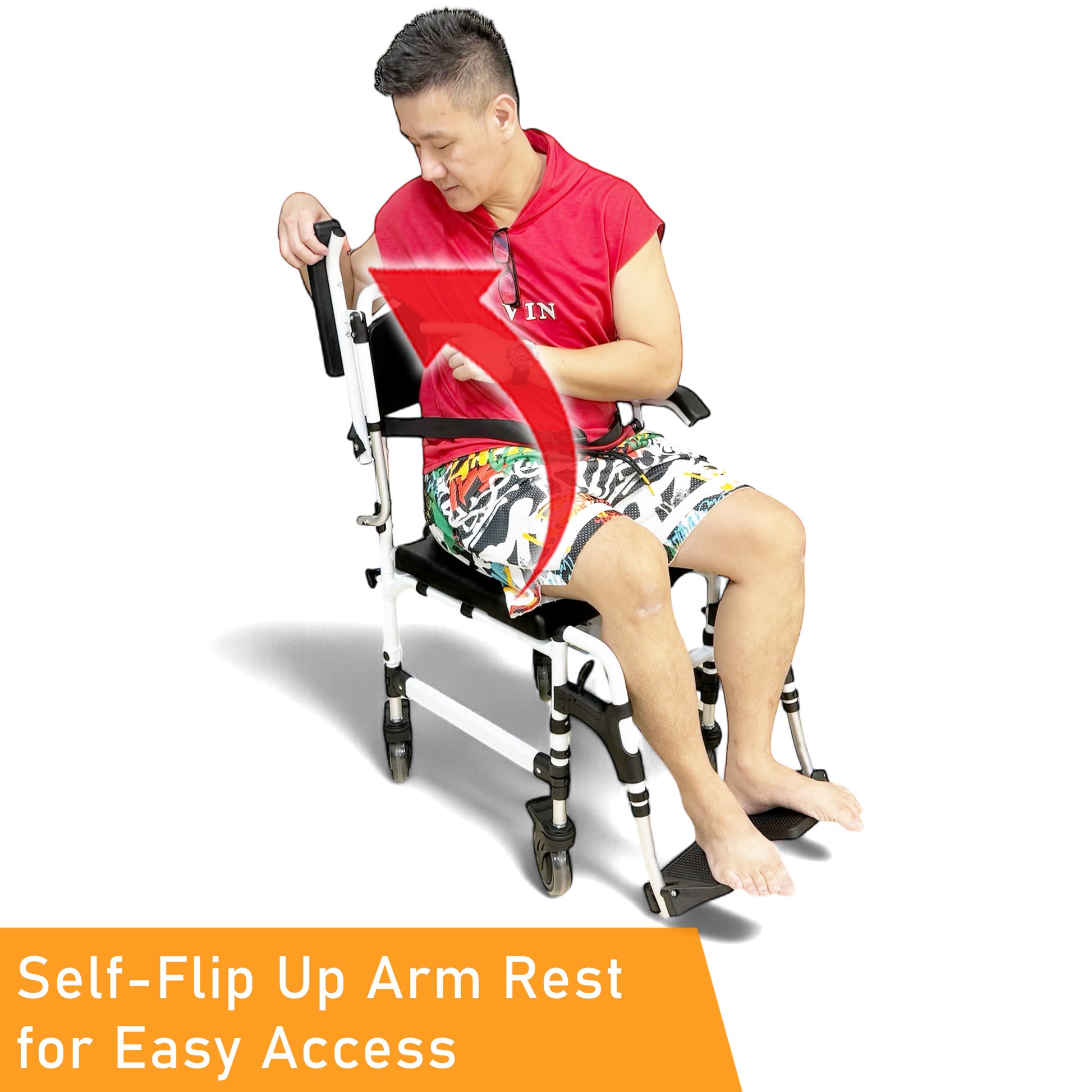 ViN K08 | Shower Commode Indoor Wheelchair - Adjustable height + 4 Lockable Rotation Wheels + Flip Up Armrest + Flip/Detach Footrest