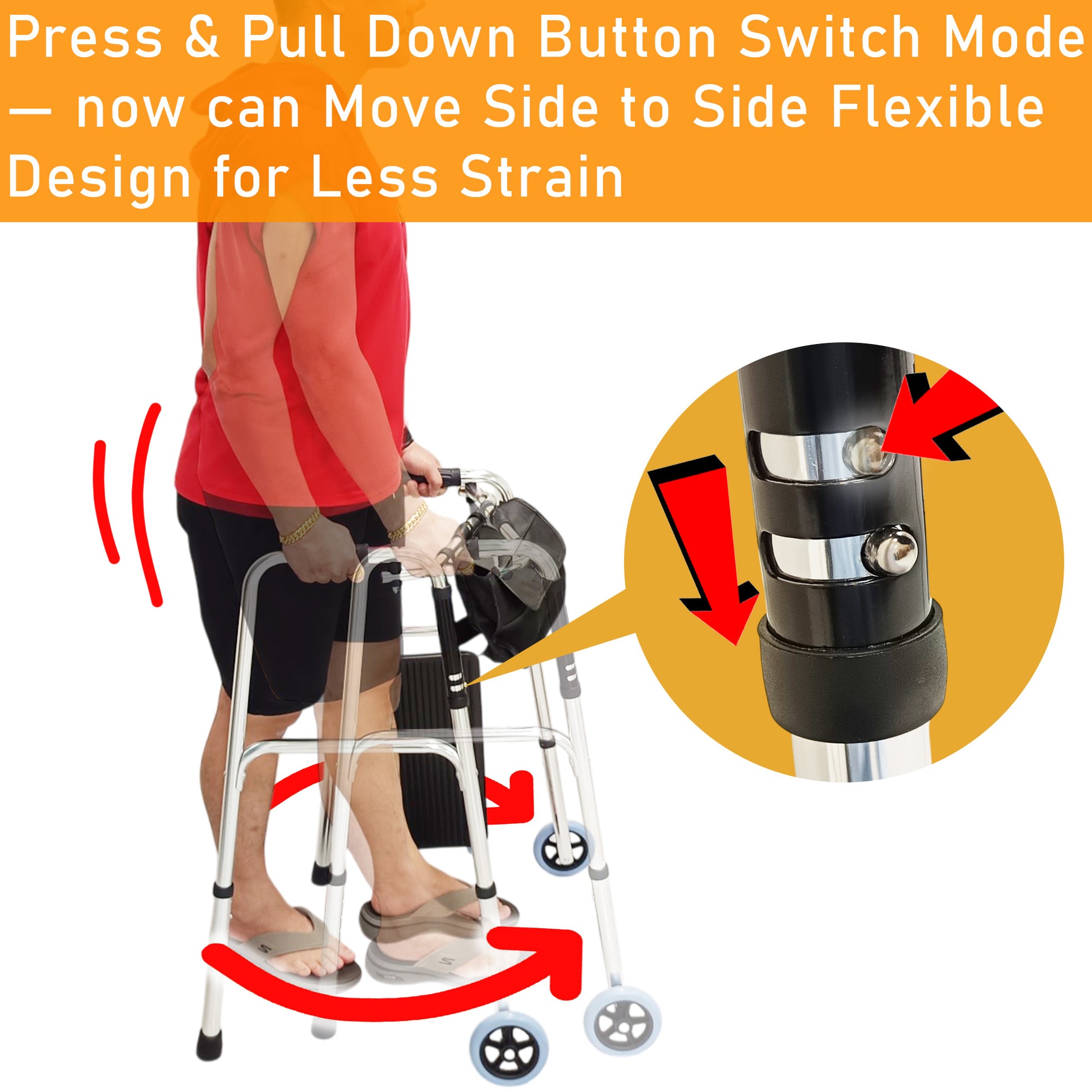 The height is adjustable 3.8 kg aluminum alloy walker is both tough and lightweight, adjustable to height up to 87 cm with a wide entrance space 43 cm, boasting rust resistance and durable welding for long-lasting connections. Its reinforced shoe thickness withstands extensive floor contact, reducing the need for frequent shoe replacements. Additionally, it offers the option to replace fixed front legs with wheeled ones, featuring a unique wheel placement for balanced weight distribution. The walker includes a conveniently removable front pouch, positioned to avoid hindering user movement. In contrast to heavy, rust-prone stainless-steel alternatives, this walker prioritizes durability and safety.
